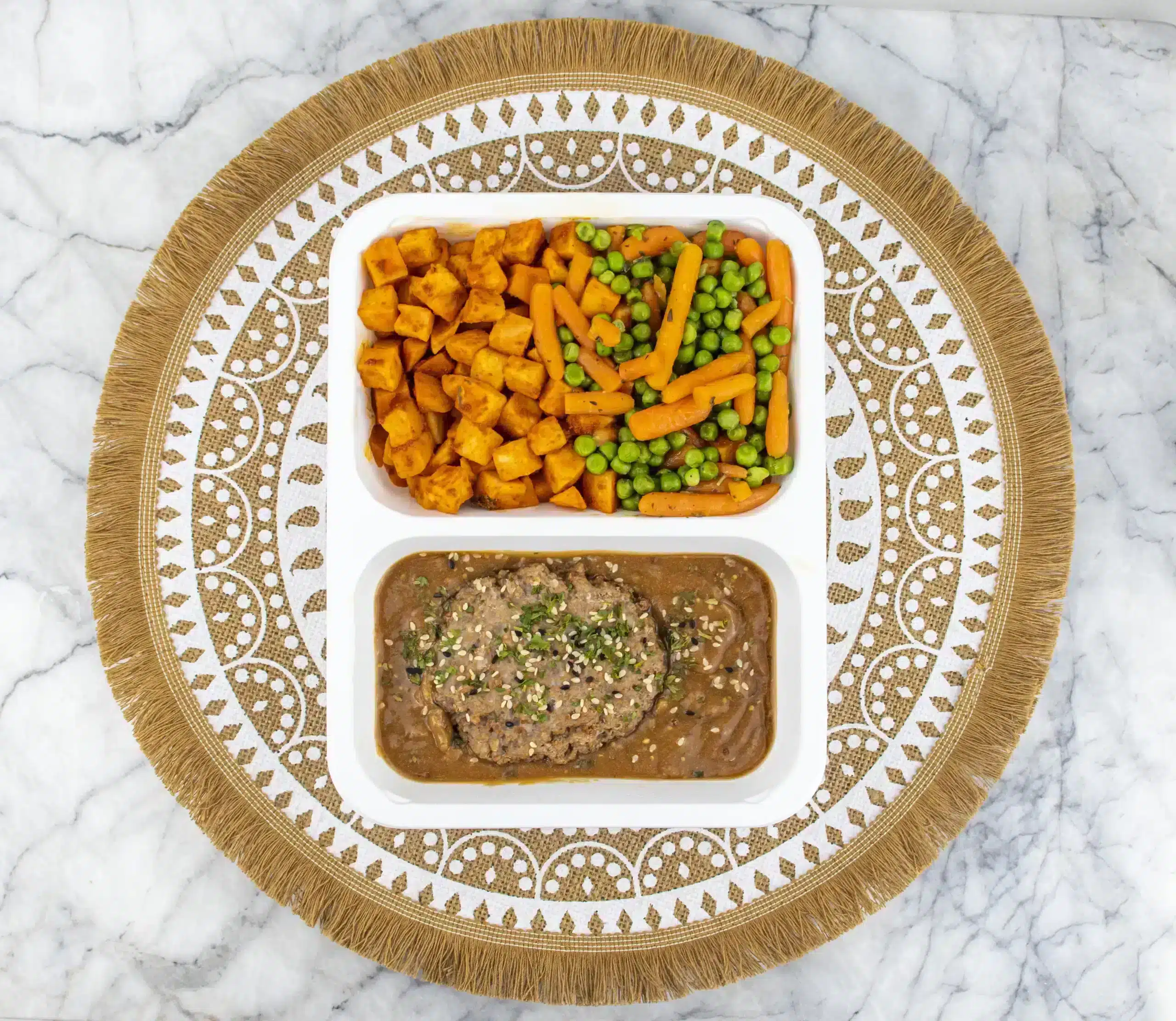 Heerlijke kip gehaktbal in een kruidige jus, aardappel gratin, erwtjes en wortels in jus en liefde.