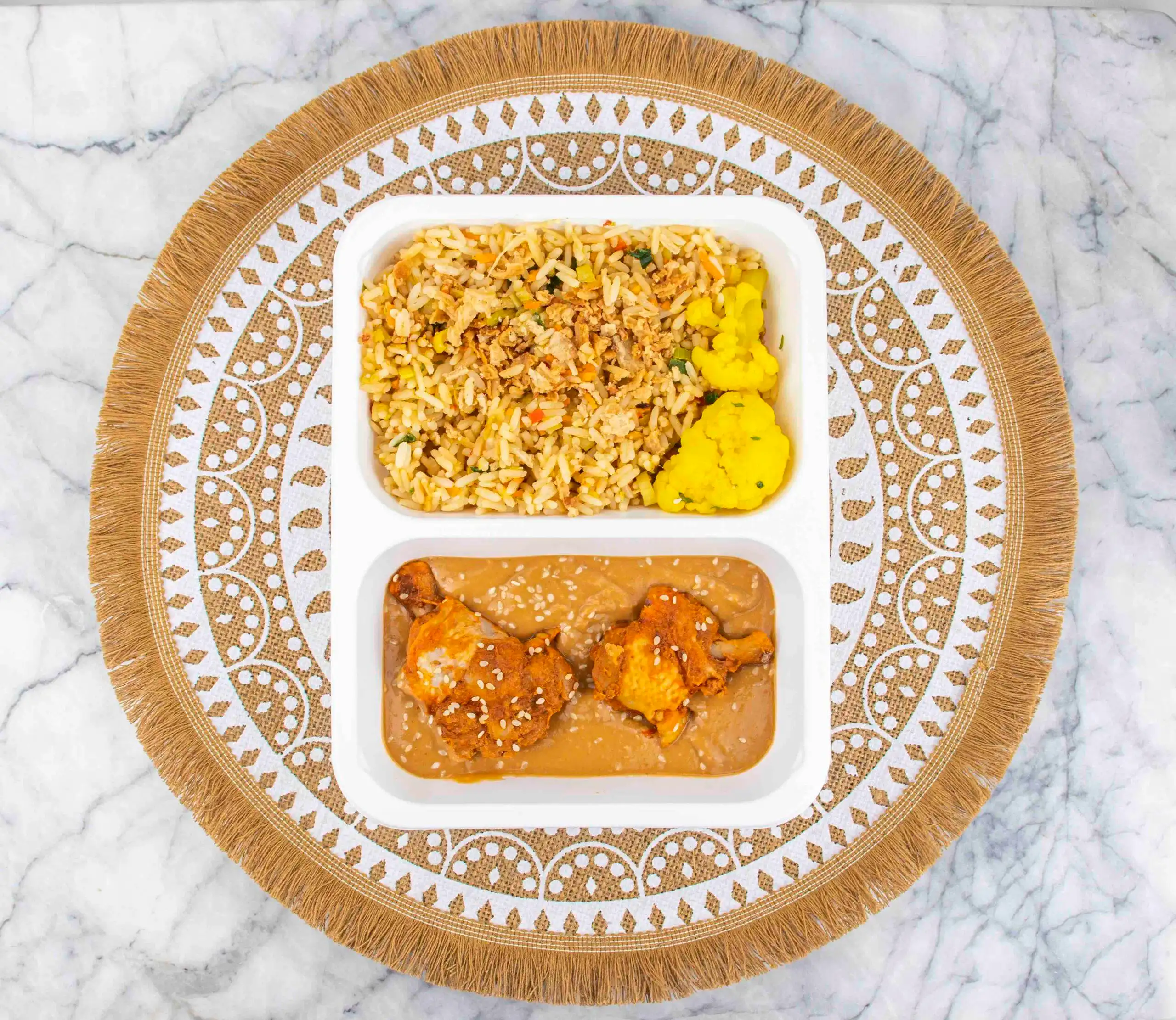 Kipborrelboutjes • satésaus • nasi • gele bloemkool